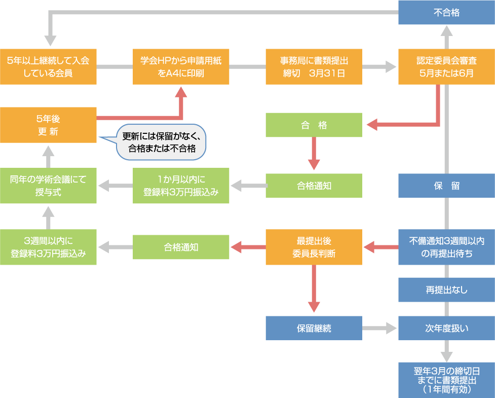 新規申請者(申請書類は、末尾の様式一覧からA4用紙に印刷すること。不明なことは本学会事務局へ文書にて問い合せること)→本学会事務局へ書留郵便にて申請書類(のコピーを認定委員会審査終了まで本人保管)の送付(令和8(2026)年3月31日までに)→事務局にて書類のまとめ(申請書、その他提出書類の一覧作成)→認定委員会において申請者の認定判定作業(令和8(2026)年6月末日までに)